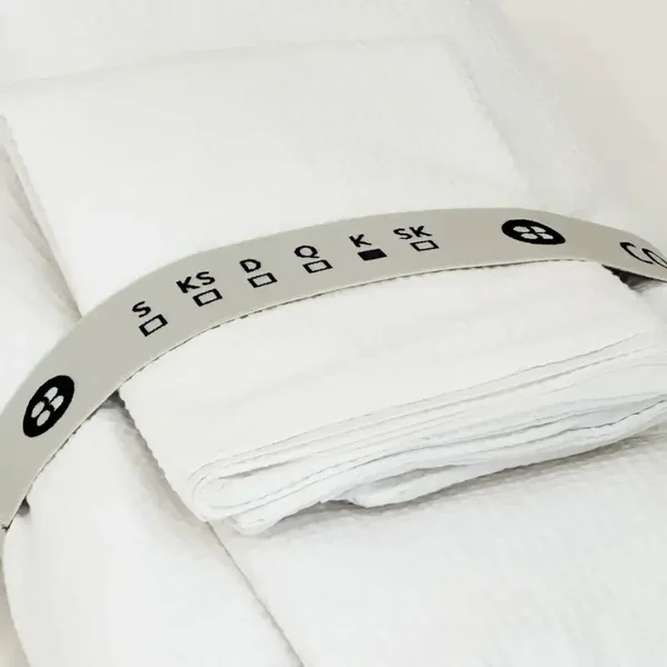Each elastic band includes a checkbox system to clearly mark the size of your duvet (S = Single, KS = King Single, D = Double, Q = Queen, K = King, SK = Super King). Simply mark the size, fold or roll your duvet, and slide on the band for quick and easy identification.